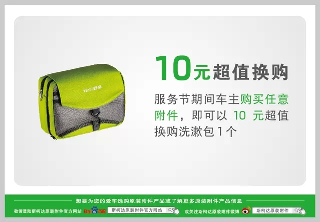 2014斯柯達服務(wù)節(jié)正在火熱進行中!4月20日至5月5日活動期間,在斯柯達原裝附件在線商城購買任意附件,只需10元即可超值換購洗漱包一個。