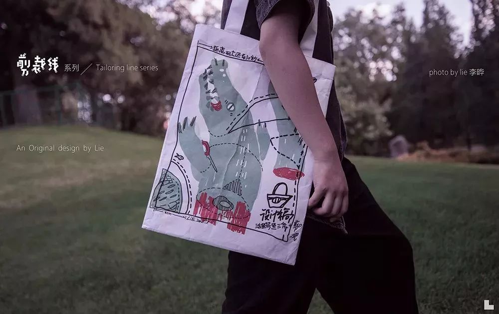 采用HP Indigo數碼印刷技術可多種方式使用的潮包(購物包、單肩挎包、雙肩背包),搭配原創IP"住在地底下的朋友"時尚插畫。小恐龍和獨角獸在火山噴發后成了住在地底下的朋友。運用Tyvek?? 防水、輕便、耐撕特性拼接成可多種方式使用的方包。