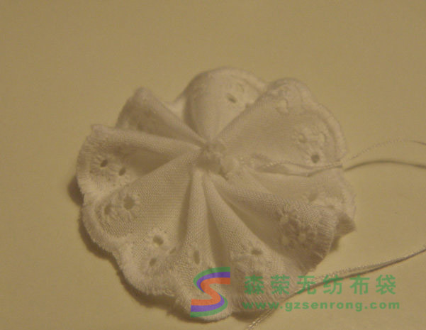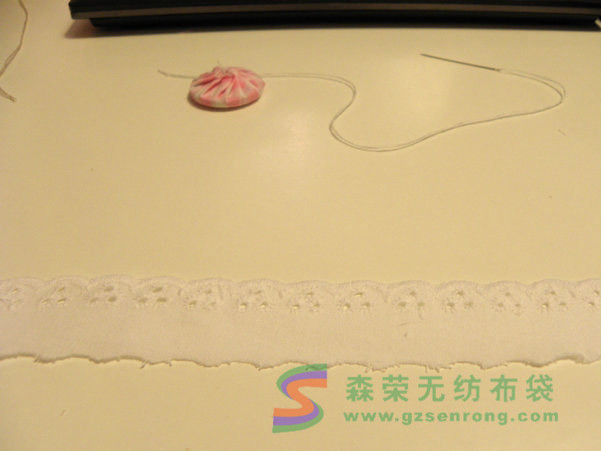 第二步,收緊兩頭做出圓筒狀。這一步看起來難,其實非常簡單。針穿透全部的表里布以及鋪棉,采用平針疏縫,但是間距要大,(如果間距太小拉緊的時候會比較吃力),而且間距注意要均勻(包型對稱漂亮就靠它了),如果不成功可以多試幾次。