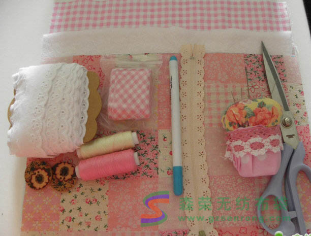 2. 拉鏈/花邊/紐扣/包邊條--在這里我用的是花邊拉鏈,但其實用普通的拉鏈也完全可以,只是上的方法有所不同而已。包邊條用普通的棉布來裁就可以,要斜紋45度哦,如果不想做的話直接taobao買也行。